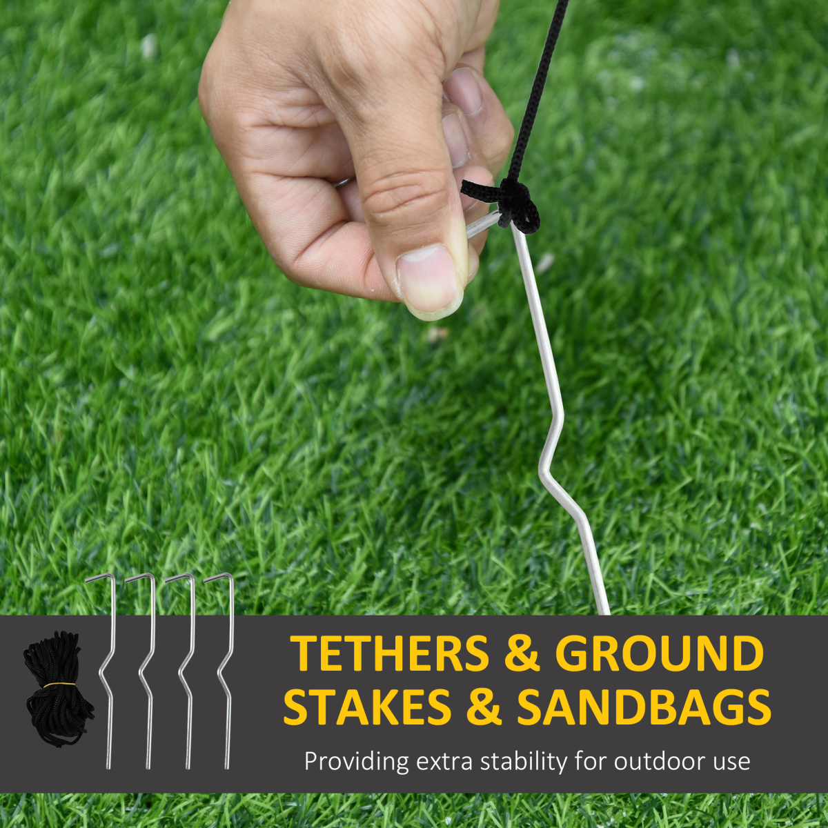 - Internal fan, two tether ropes, four ground stakes, and sandbag included