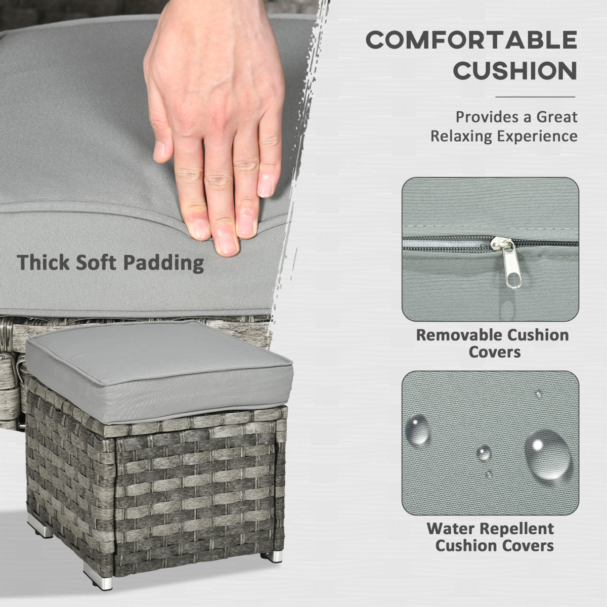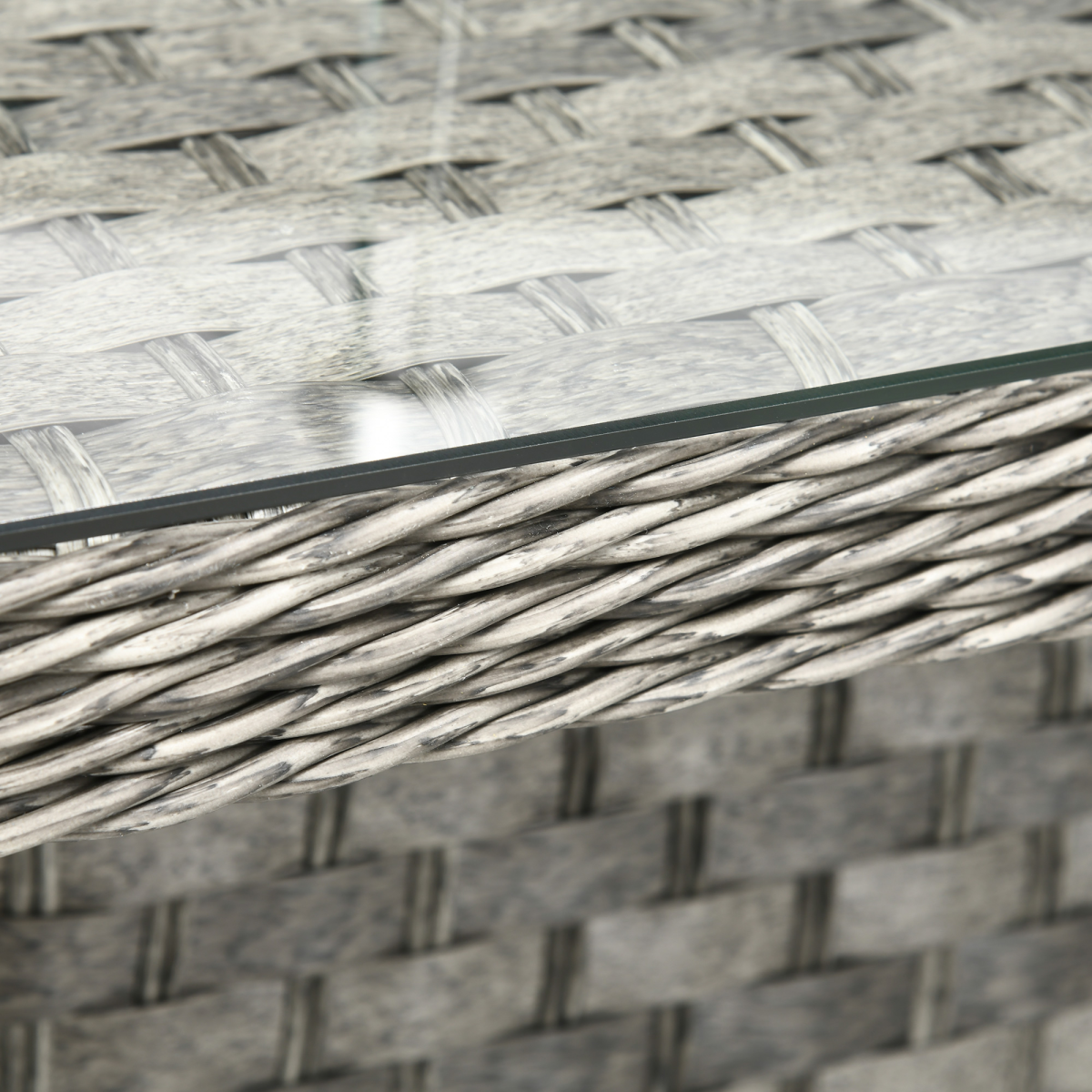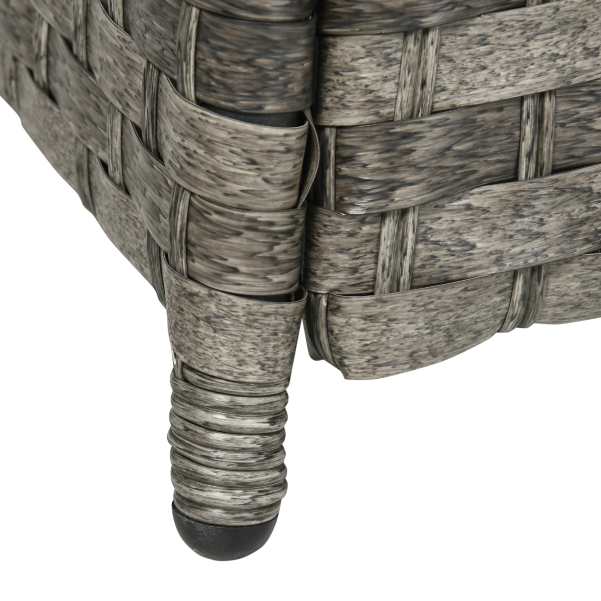 Fire pit table: Great for evenings and milder months. Wind guard for safety, with a 50,000 BTU output - you can keep warm as you sit around this garden sofa set. Glass table top is sleek and easy to clean.Seven-piece set: Rattan garden furniture set comes with two corner loveseats, a standard loveseat, three footstools and matching fire pit table. Freestanding pieces to organise into a shape you want.Comfortable: Padded seat and back cushions so you can sink into this garden sofa set and relax for long periods. Removable and washable covers.Steel, wrapped in rattan: Powder coated metal for a strong core. Stylish and weather-resistant plastic wicker makes each piece in this rattan garden sofa set extra durable and sturdy.Dimension: Left Double Corner Sofa: 130W x 77D x 82Hcm. Right Double Corner Sofa: 130W x 77D x 82Hcm. Double Corner Sofa: 134W x 77D x 82H cm. Table: 150L x 85W x 64Hcm. Footstool: 38W x 38D x 32.5Hcm. Weight Capacity: Sofa: 240kg. Footstool: 120kg. Table: 50kg. Assembly required.